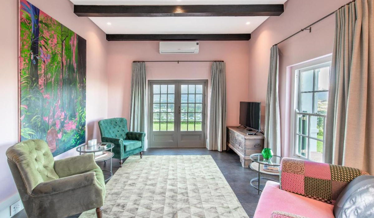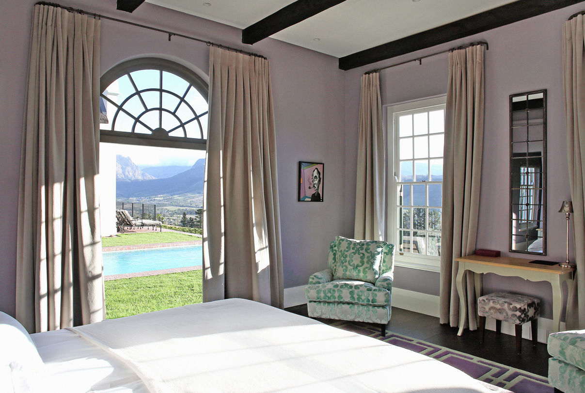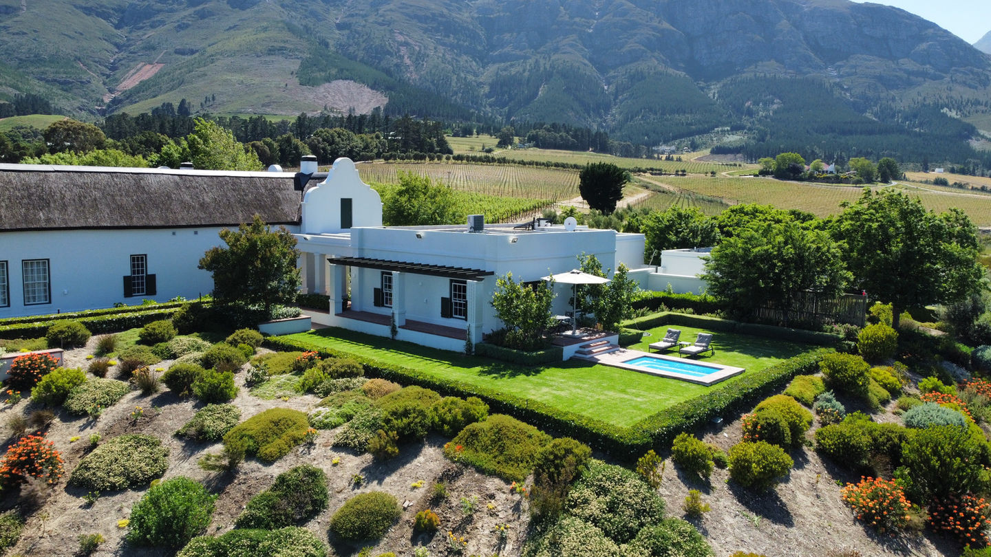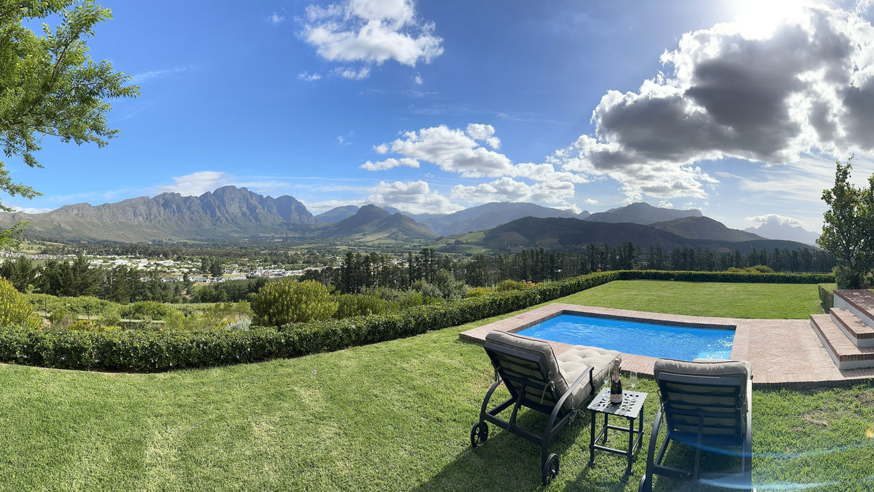 The large patio and garden area boast an inviting climate-controlled infinity pool, offering guests breathtaking views of the picturesque Franschhoek valley.